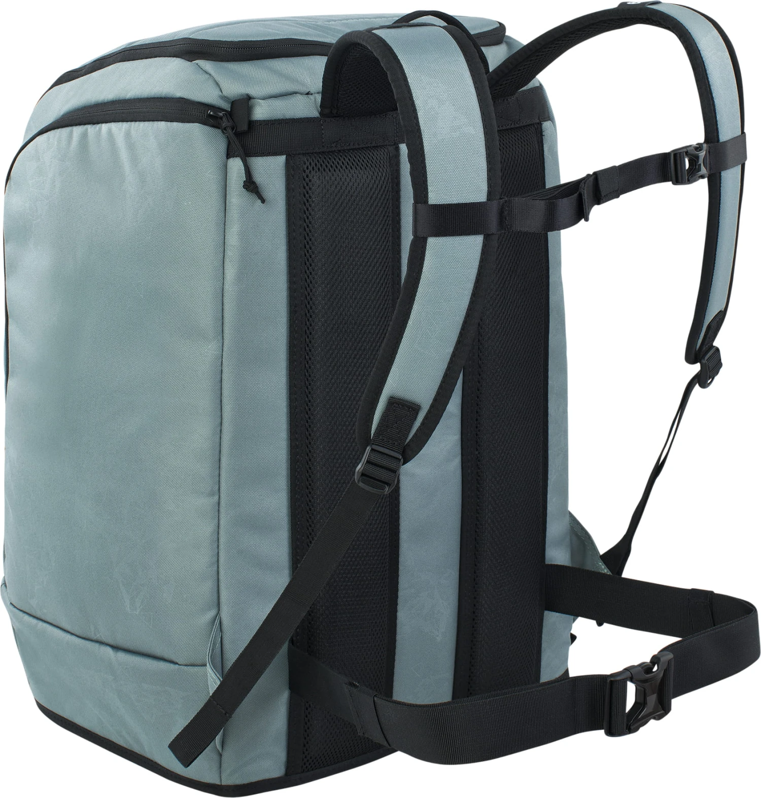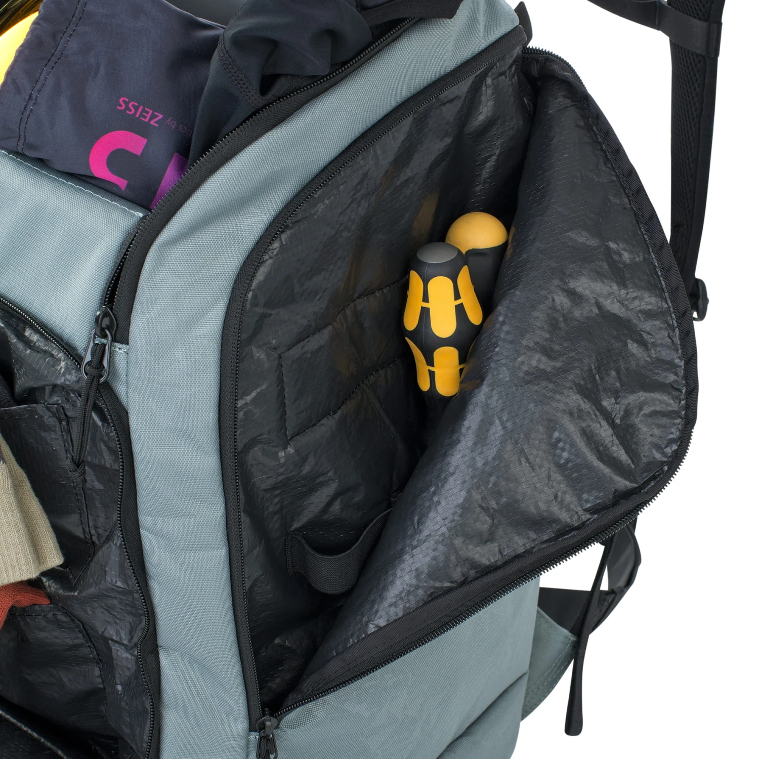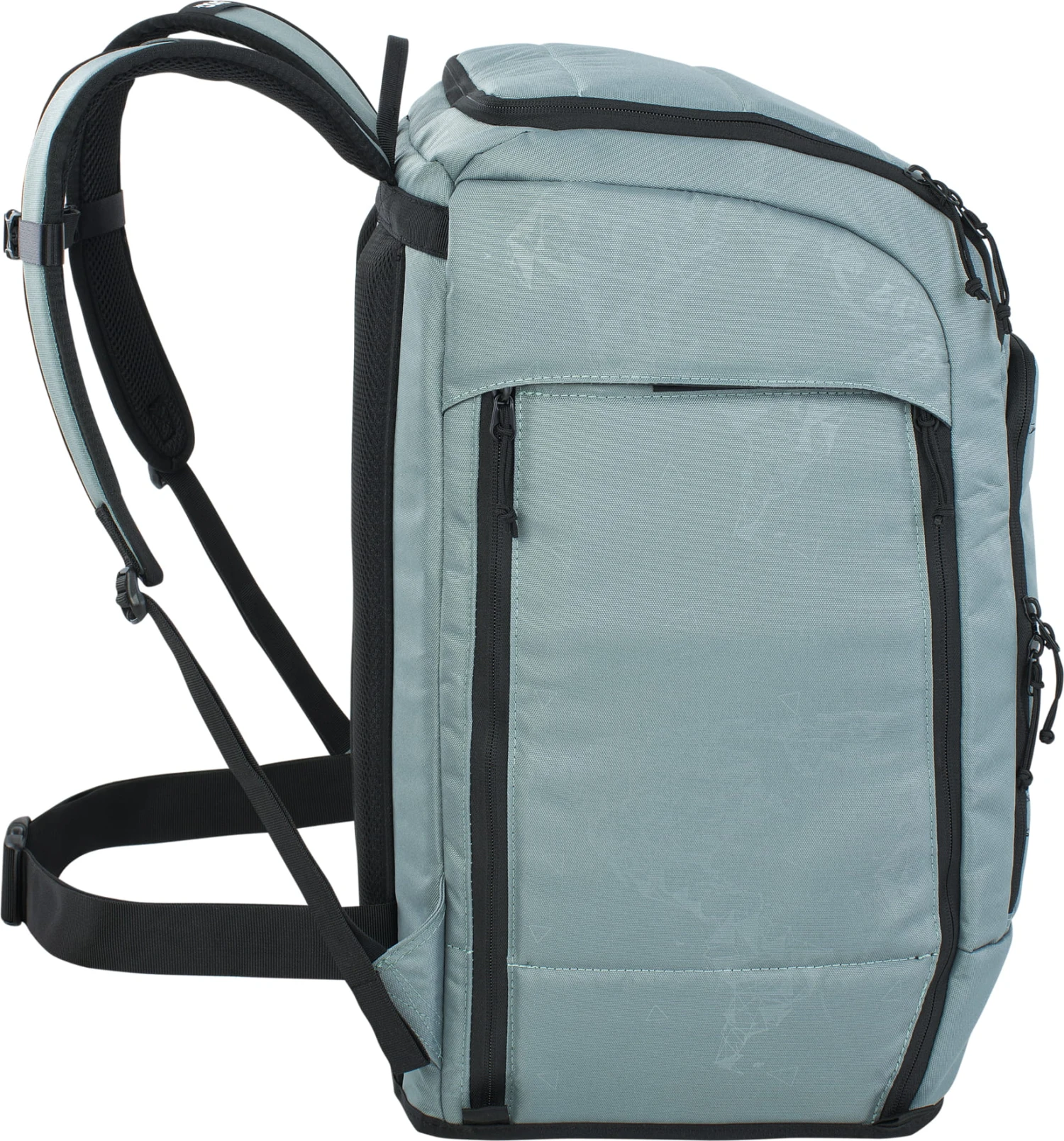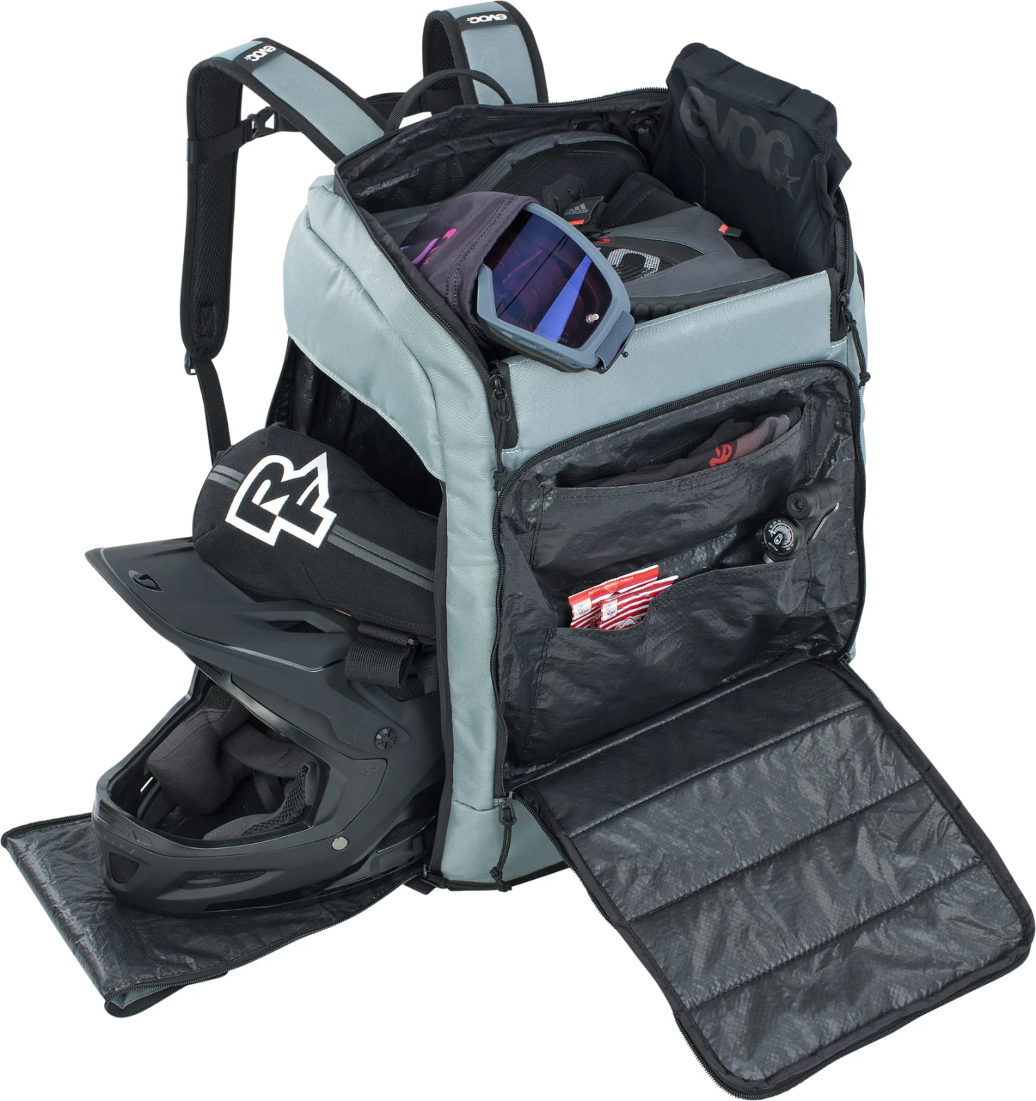 - Twee grote hoofdvakken voor laarzen, helm of kleding en een zijvak met rits en bevestigingspunten voor kleine uitrusting