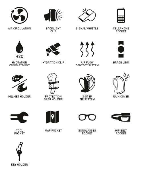 - Bevestigingssysteem voor: Helm (XC, integraal), beschermers (opbergbaar)