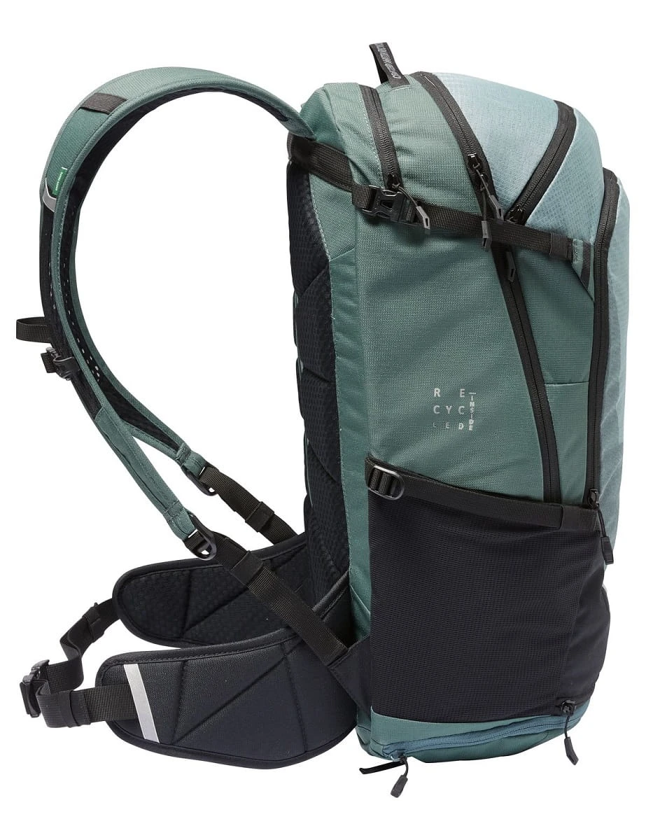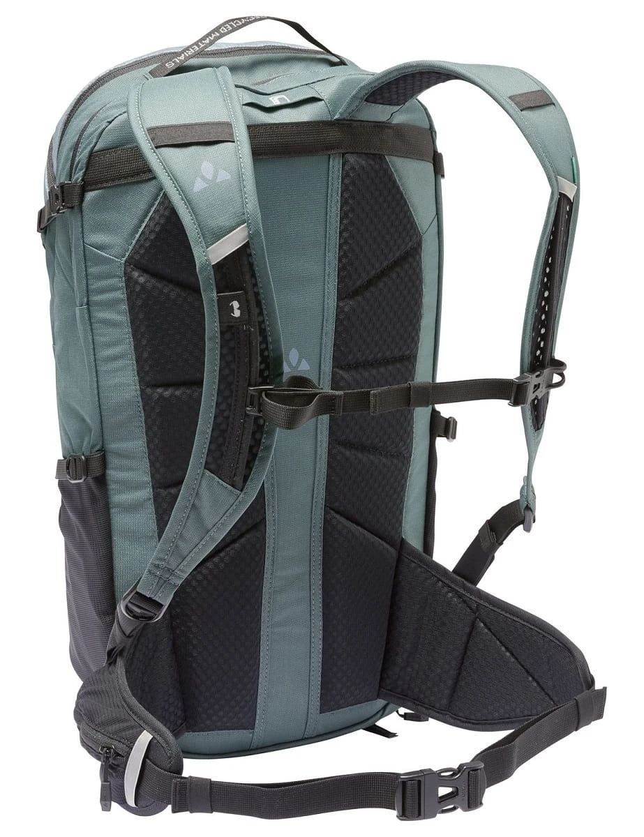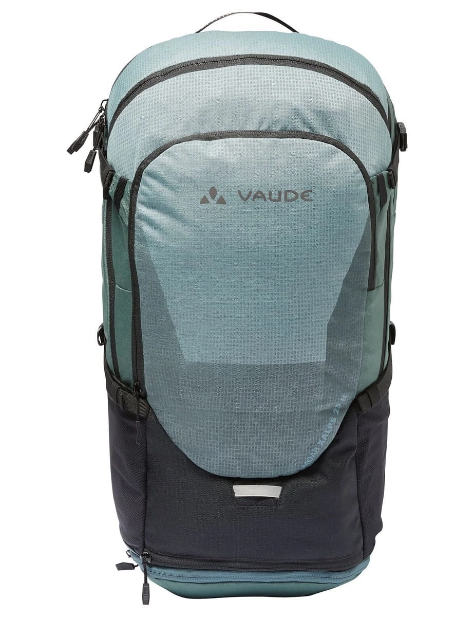 Met de evolutie van ons succesvolle Bracket Xalps model, zijn er geen organisatie- en oriëntatieproblemen meer! Het geoptimaliseerde Ventex Active-rugsysteem zorgt voor een perfecte pasvorm en een goede ventilatie van de 25-liter Transalp-rugzak, met meer padding in het gebied van de lendenwervelkolom om drukpunten duidelijker te ontlasten. De comfortabele heupgordel trekt het zwaartepunt van de rugzak perfect naar de rug en zorgt in combinatie met de Ergoshape schouderbanden voor een perfecte pasvorm met optimale bewegingsvrijheid op de fiets. De rugzak is verdeeld in drie compartimenten. Het grote hoofdvak kan worden verdeeld voor een betere organisatie van kleding en proviand en biedt aparte toegang van boven of beneden. Vooraan is er nog een vak voor een bril of portefeuille. Het gereedschapsvak aan de voorkant van de rugzak biedt plaats aan alles wat bij pech snel bij de hand moet zijn, en is goed georganiseerd. Onderaan is een vak voor een kaart of andere documenten. Onderaan de voorkant zit een vak waar de helmhouder netjes kan worden opgeborgen. Op de rechter heupgordelvleugel biedt een zakje voldoende ruimte voor een smartphone of een powerbar. Tot de kenmerken behoren elastische zijvakken, een apart vak voor een drinkbaar waterreservoir, compressiebanden in de zijvakken, een regenhoes in het aparte bodemvak en reflecterende elementen voor meer veiligheid in het donker. Alle Moab-rugzakmodellen passen perfect bij de stijlvolle Moab-kleding. Het bluesign® gecertificeerde gerecyclede materiaal van de Moab Xalps 25 II is gemaakt met Eco Finish milieuvriendelijk waterafstotend middel zonder fluorkoolstoffen (PFC).